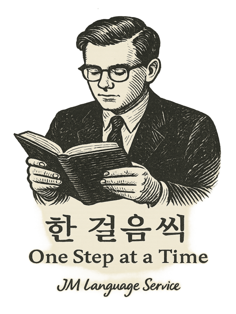 This new design from JM Language Service captures that message with a vintage-style illustration of a man readingโ€”calm, focused, grounded. Combined with the Korean phrase โ€œํ•œ ๊ฑธ์Œ์”ฉโ€ (โ€œOne Step at a Timeโ€), the artwork delivers a quiet reminder to slow down and stay present.